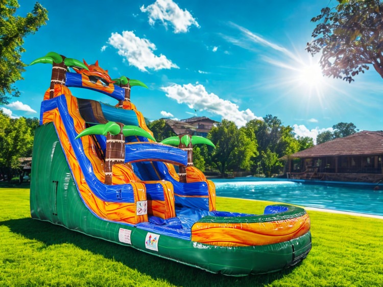 Make a BIG splash at your next event with the Jungle Splash 20ft Water Slide! This towering jungle-themed inflatable features tall palm trees, vibrant tropical colors, and a 20ft tall slide that delivers thrilling rides and an exciting splash landing at the bottom. Perfect for keeping kids cool and active during hot summer days.